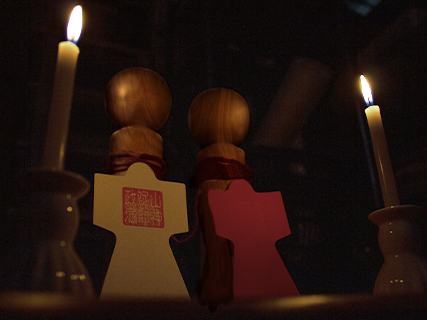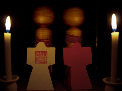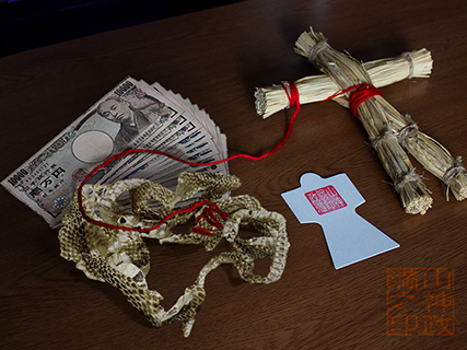 山神政満独自の形代呪法では、藁や霊木で作成した形代(カタシロ)に対象者の魂や念を降霊術で降ろします。そこにヒトガタや呪物を干渉させ、縁結びや金運招福の縁を結んだり切ったりなど複雑な縁を導き浄化します。